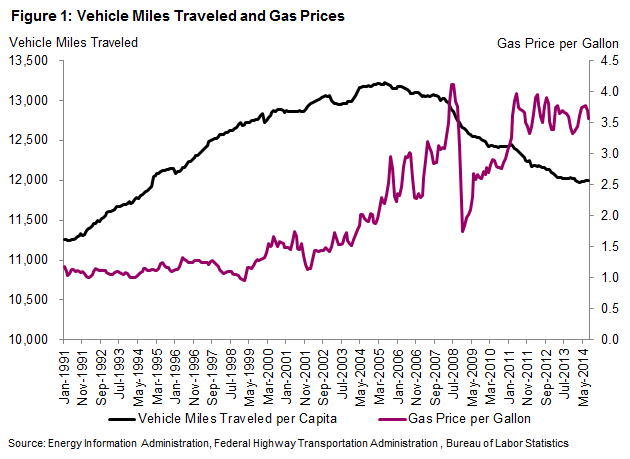 Gas prices remained under $2 per gallonrnfor the first 13 years she tracks in Figure 1 while per capital vehicle milesrntraveled (VMT) increased steadily. Thosernmiles began to level off as gas prices surpassed $2 and then to decline as theyrnreached $3 per gallon. After that mileagerndeclined steadily even as gas prices bounced around, surpassing $4 on onernoccasion and falling below $2 on another. rnVMT in August 2014 were at about the same levels as in 1994. Boesel notes that some of the drop in drivingrncan be attributed to the extreme stress (and probably a drop in commuting duernto unemployment) of the financial crisis. </p