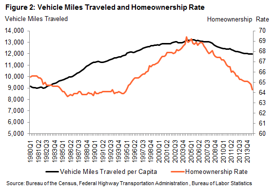 Homeownership rates more or less paralleledrnVMT between 1994 and 2004. During thisrnperiod VMT increased by 12 percent and homeownership rose by 5 percentage points.rn Boesel says that, with gas prices under $2 somernof the increase in homeownership occurred as many homebuyers moved further fromrnthe urban core to buy larger and more expensive homes. Then in 2005 the trend reversed and homeownershiprnas well as VMT has now fallen back to 1994 levels. </p