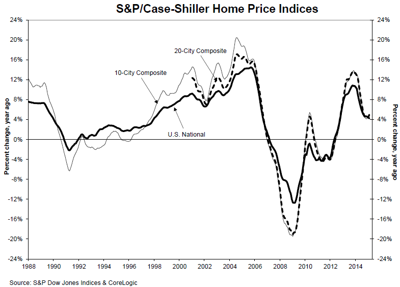 The 10-Ciity Composite was up 4.8 percent compared to February 2014 andrnthe 20-City Composite rose 5.0 percent. rnThe two indices had posted annual increases of 4.3 percent and 4.5rnpercent respectively in January.  </p