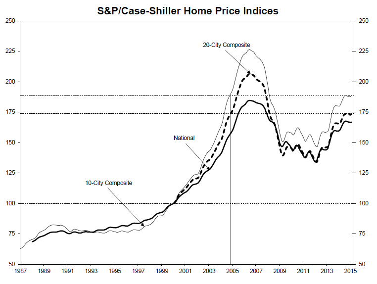 David M. BlitzerrnManaging Director and Chairman of S&P’s Index Committee said, “Home prices continuernto rise and outpace both inflation andrnwage gains.  The S&P/Case-Shiller National Index has seen 34 consecutive months with positivernyear-over-year gains; all 20 cities have shown year-over-year gains everyrnmonth since the end of 2012. While prices arerncertainly rebounding, only tworncities – Denver and Dallas -rnhave surpassed their housingrnboom peaks. Nationally, prices are almostrn10% below the high set in July 2006. Las Vegas fell 61.7% peak to trough and has the farthest to go to set a new high; it is 41.5% below its high. If a complete recoveryrnmeans new highs all around, we’re not there yet.</p
