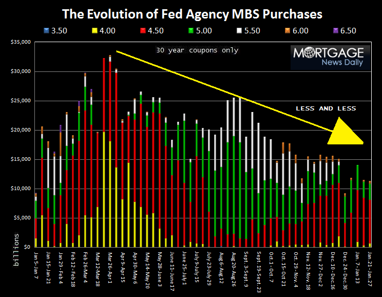 Below is a chart illustrating the evolution of the Federal Reserve's Agency MBS Purchase Program. Notice over the past few months the Fed has reduced their purchases and used remaining funds to offset new loan production supply, 4.50 (RED) and 5.00 (GREEN) MBS coupons specifically,  which has helped keep mortgage rates low. Overall, weekly purchases continue to decline, yet mortgage valuations remain stable.