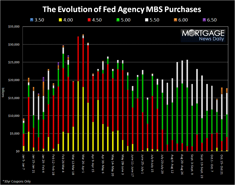 The Federal Reserve today reported on their weekly purchases of agency mortgage-backed securities (MBS). In the five trading days between October 22 and October 28, the Federal Reserve purchased a total of $21.906 billion agency MBS. In those five days the Federal Reserve sold $3.906 million agency MBS (dollar rolls) with the majority of roll transactions in FN 5.0s and FN 4.5s. After sales, the Fed's weekly net purchases totaled $18.00 billion.