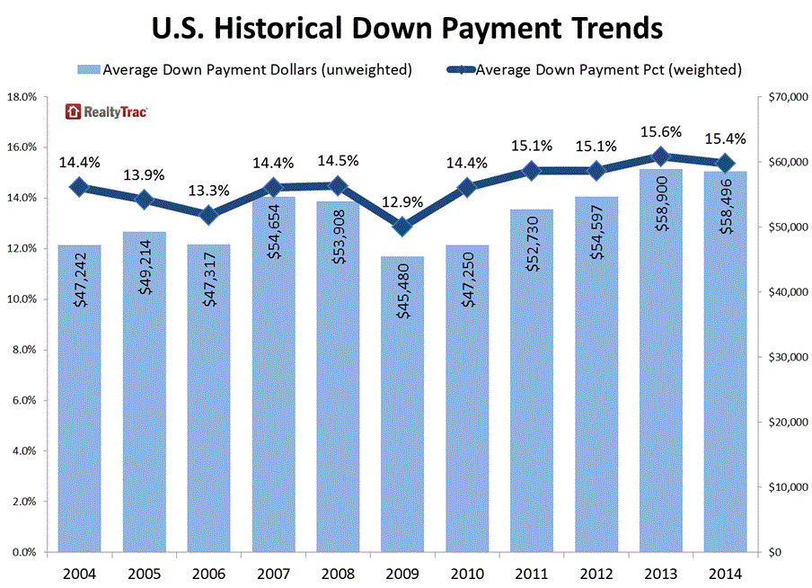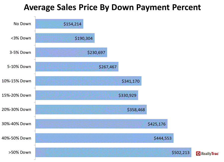 RealtyTrac found a strong correlationrnbetween the percentage put down on a purchase and the price of the home. For purchases where there was no downrnpayment (the combined loan amount was actually more than the purchase price,rntypically indicating a down payment assistance program or purchase-rehab loanrnwas involved) the average sales price was $154,214, while for purchases with arndown payment of less than 3 percent but more than 0 percent, the average salesrnprice was $190,304. For every percentrnthe down payment increased the average purchase price also rose, an exceptionrnbeing between the 10 to 15 percent and 15 to 20 percent ranges. On the otherrnend of the spectrum, the average purchase price in 2014 was $502,213 forrnpurchases when the borrower put down 50 percent or more.</p