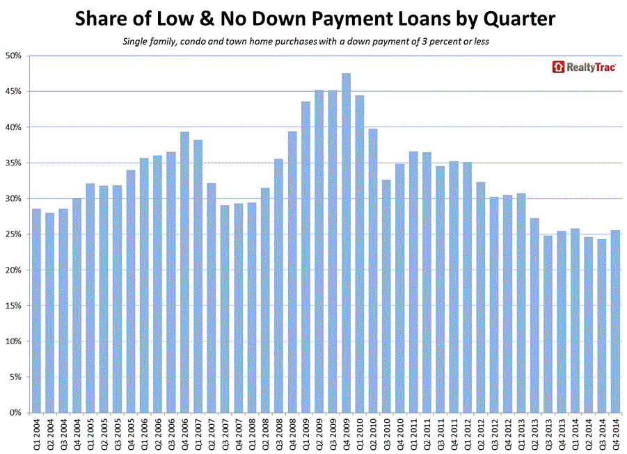 Of course this may not be a factor of demand, RealtyTrac didrnnot venture into that area. More likelyrnit is the result of stricter underwriting standards, perhaps for privaternmortgage insurance as well as the loans themselves. Nonetheless, 25 percent of buyers takingrneither conventional or FHA loans in 2014 put down less than 3 percent for arnhome purchase compared to 27 percent in 2013.</p