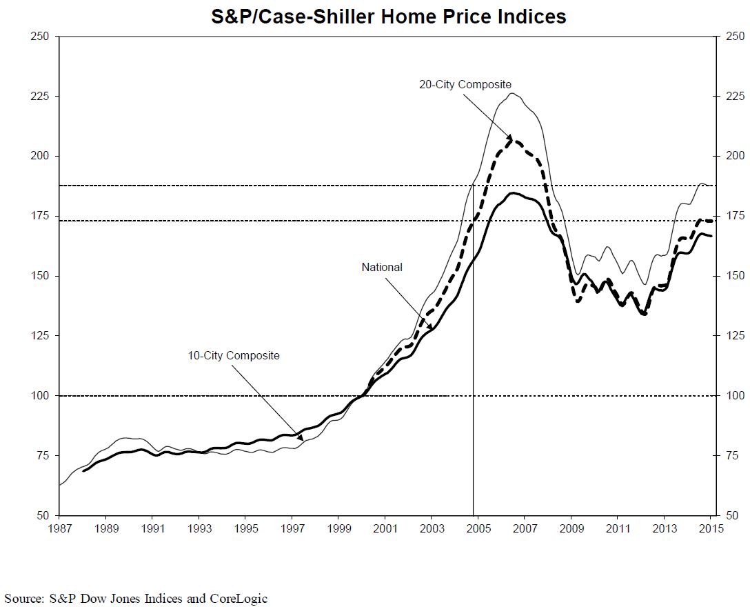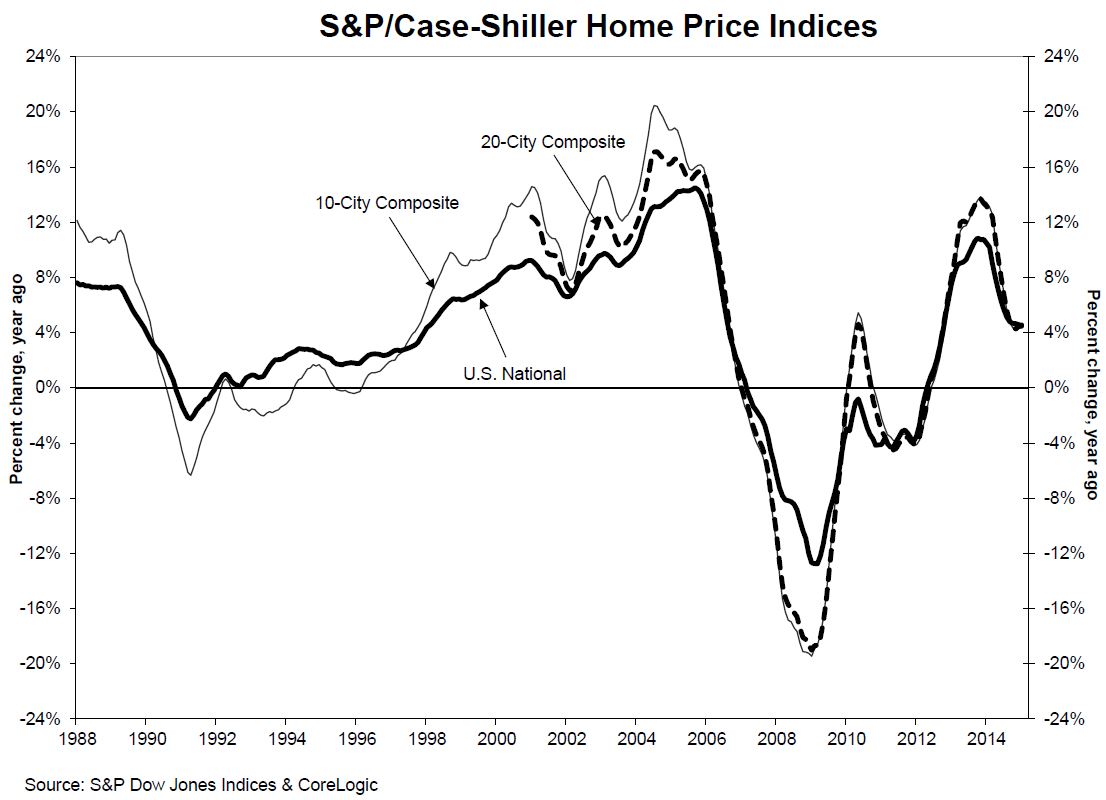 DavidrnM. Blitzer, Managing Directorrnand Chairman of the IndexrnCommittee for S&PrnDow Jones Indices said, “The combination of low interest rates and strongrnconsumer confidence based on solid job growth, cheap oil and low inflation continuernto support furtherrnincreases in home prices.  Regional patterns in recent monthsrncontinue: strength in the west and southwest paced by Denver and Dallas with results ahead ofrnthe national index in the California cities, the Pacific Northwest and LasrnVegas. The northeast and Midwest are mostly weaker than the national index.</p
