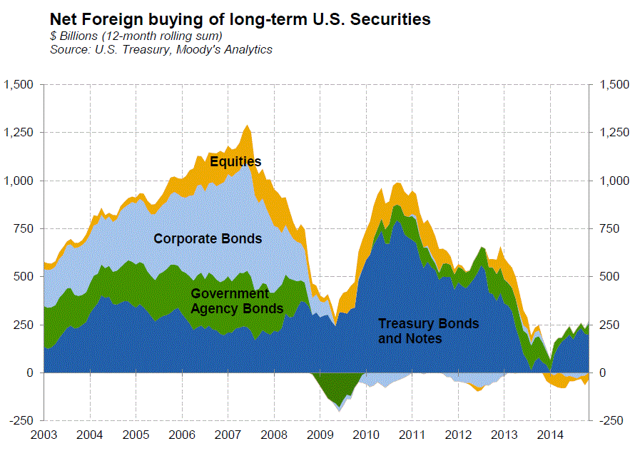 At the same time,rnevents in the global arena such as reduced interest rates in Europe and Japanrnand growing concerns over global growth have driven a flight to safety and intornpurchases of long-term U.S. securities. rnThe latest data from November, portrayed in the chart below, shows thernrecent surge in net foreign buying of these securities, especially Treasuryrnbonds and notes. Recent trends support earlierrnresearch showing that net foreign purchases of long-term securities have arnlarge impact on long-term rates.</p