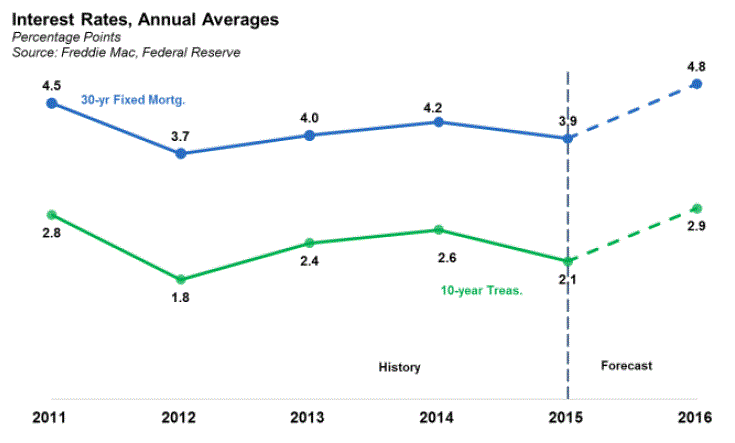 But for the 30-yearrnfixed rate mortgage, change is good. Therncompany estimates that the average rate for 2015 will be 3.9 percent ratherrnthan the 4.2 percent it projected last month. rnAverage rates in 2016 will rise to 4.8 percent.</p