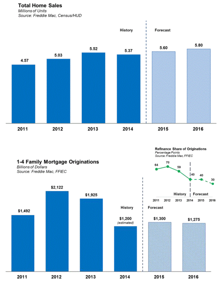 Further, lower ratesrnalong with an improving jobs picture continue to provide a brighter outlook forrnhousing activity this year than last. rnFreddie Mac holds to its prior forecasts of 5.6 million in home salesrnthis year and 1.18 million residential construction starts. They have raised their estimate of home pricerngrowth from January’s 3.5 percent to 3.9 percent in 2015. The projections for higher home prices andrnlower rates have led them to push estimates for 2015 one-to-four familyrnmortgage originations up from $1.2 trillion last month to $1.3 trillion, easingrnback to $1.275 trillion in 2016. rnRefinancing will also take a larger share of overall mortgage business,rnrising is the revisions from 35 to 40 percent. </p