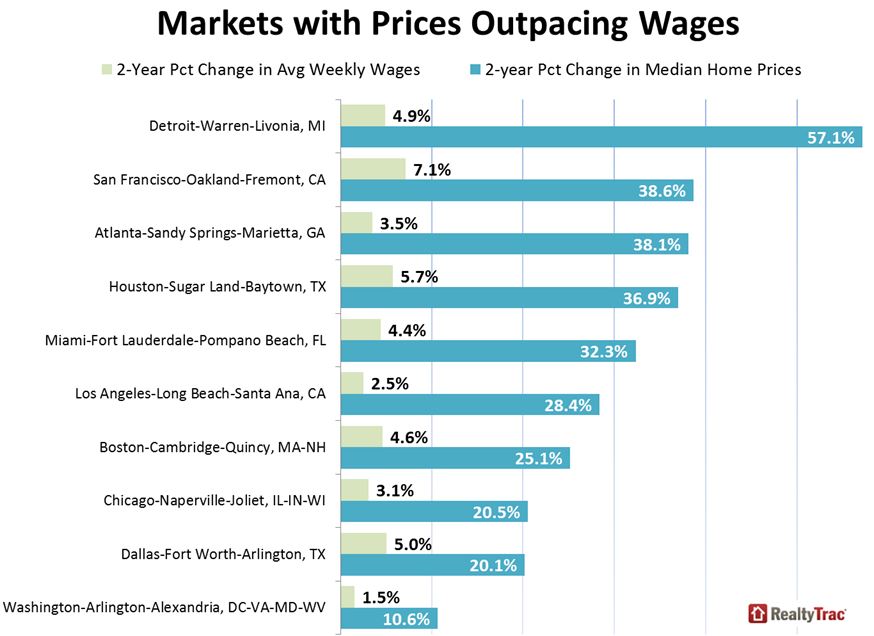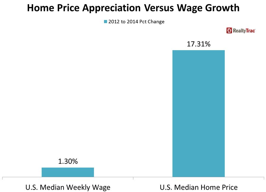 RealtyTracrnfound that home prices during the study period increased by 17 percent while medianrnwages nationwide were up only 1.3 percent. rnThus the appreciation in housing values outstripped the growth in wagesrnby a ratio of 13 to one. Further,rnRealtyTrac found that a greater increase in home values compared to wagesrnprevailed in over three-quarters (76 percent) of the housing markets.</p