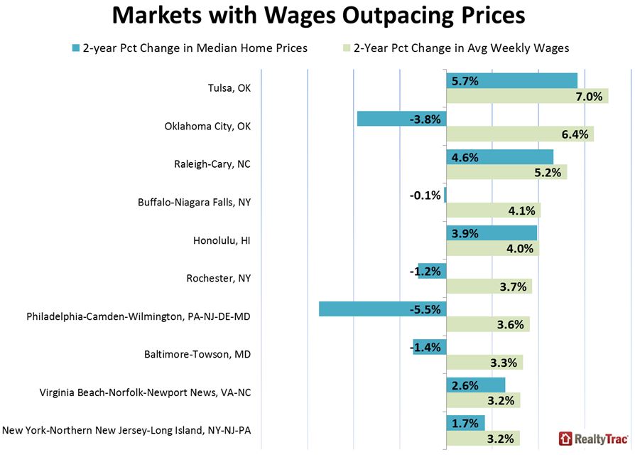 Wage growth outpaced home pricernappreciation in 44 of the 184 metro areas (24 percent) with a combinedrnpopulation of 51 million. Metropolitan statistical areas with the lowest ratiornof home price appreciation to wage growth were Hagerstown-Martinsburg,rnMaryland-West Virginia, Wichita, Kansas, Des Moines, Iowa, Gulfport-Biloxi,rnMississippi, and Harrisburg, Pennsylvania.</p