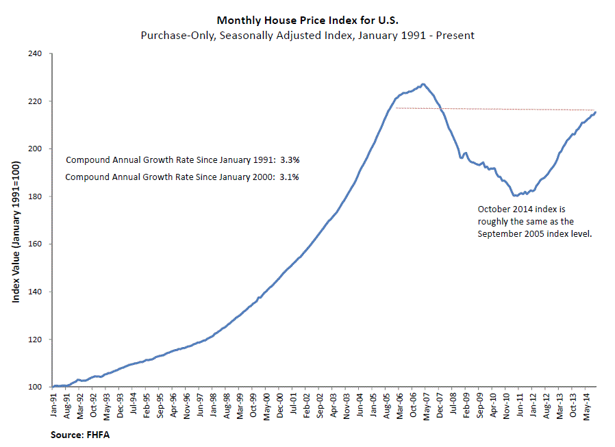 FHFA said that its HPI for October indicates that pricesrnnationally are roughly the same as they were in September 2005.