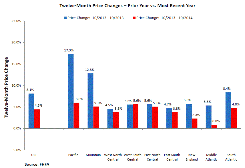 Some deceleration in price gains occurred in all but onernregion and was particularly dramatic in the Pacific division where a 17.3rnpercent gain in the 12 months ended October 2013 became a 6.0 increase thernfollowing year.  Increases in the Westrnalso slowed, going from 12.8 percent to 5.1 percent in the two relevant timernperiods.</p