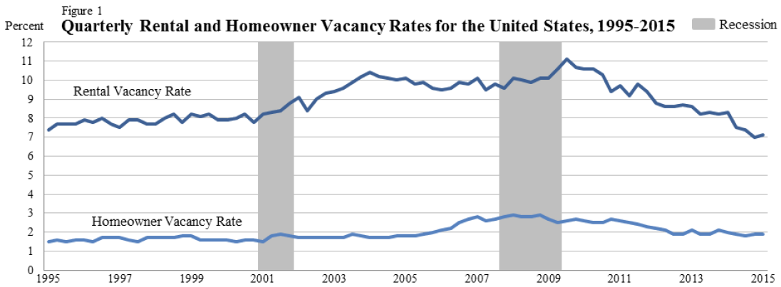 The vacancy rate for rental units in the first quarter was 7.1rnpercent, down from 8.3 percent one year earlier and 0.1 percent higher than inrnthe previous quarter. Homeowner vacanciesrnwere at 1.9 percent, unchanged from the previous quarter and down 0.1 percent year-over-year.rn</p