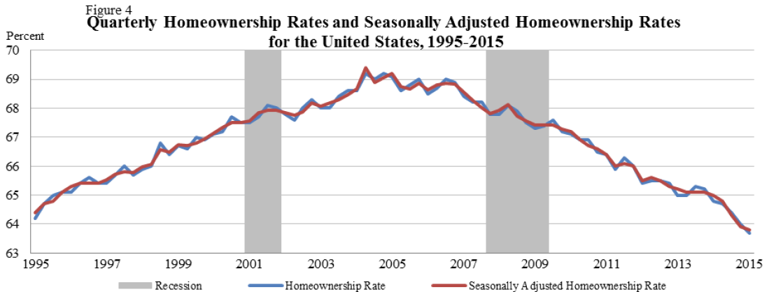 The homeownership rate in the U.S. peaked in the second andrnfourth quarters of 2004 when it hit 69.2 percent but has fallen steadily sincernthen. The current rate is lower than atrnany time in the data provided by the Census Bureau, dating back to the firstrnquarter of 1995. </p