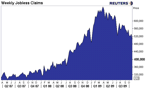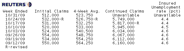 In the week ending October 31, 2009, jobless claims fell to 512,000 from 532,000 in the previous week, which was revised higher from 530,000. Economists only expected 523,000 new claims for unemployment benefits, so this read was better than expected. This is the lowest number of jobless claims since the week ending January 3, 2009.