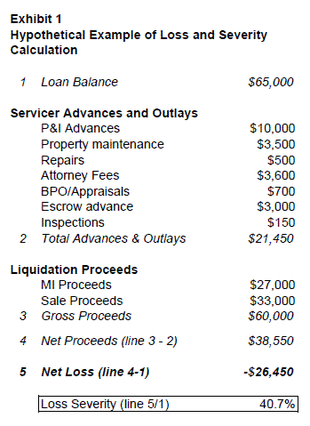 The calculation of losses for an individual loan is fairly straightforward. As shown in Exhibit 1, the proceeds received in the liquidation process include both the net sale price of the property and, if applicable, proceeds from mortgage insurance. These amounts are reduced by the servicer’s ability to recover its costs. While the largest costs typically result from principal and interest advances to the trust (which are made at the note rate less the servicing fee), other costs are also recoverable. These include escrow advances and property maintenance costs (which grow over time), as well as the costs associated with foreclosure and/or the sale of the property (attorney fees, appraisals, BPOs, etc.). The latter are mostly fixed in nature and not dependent on elapsed time.