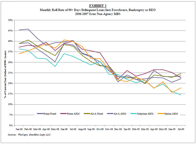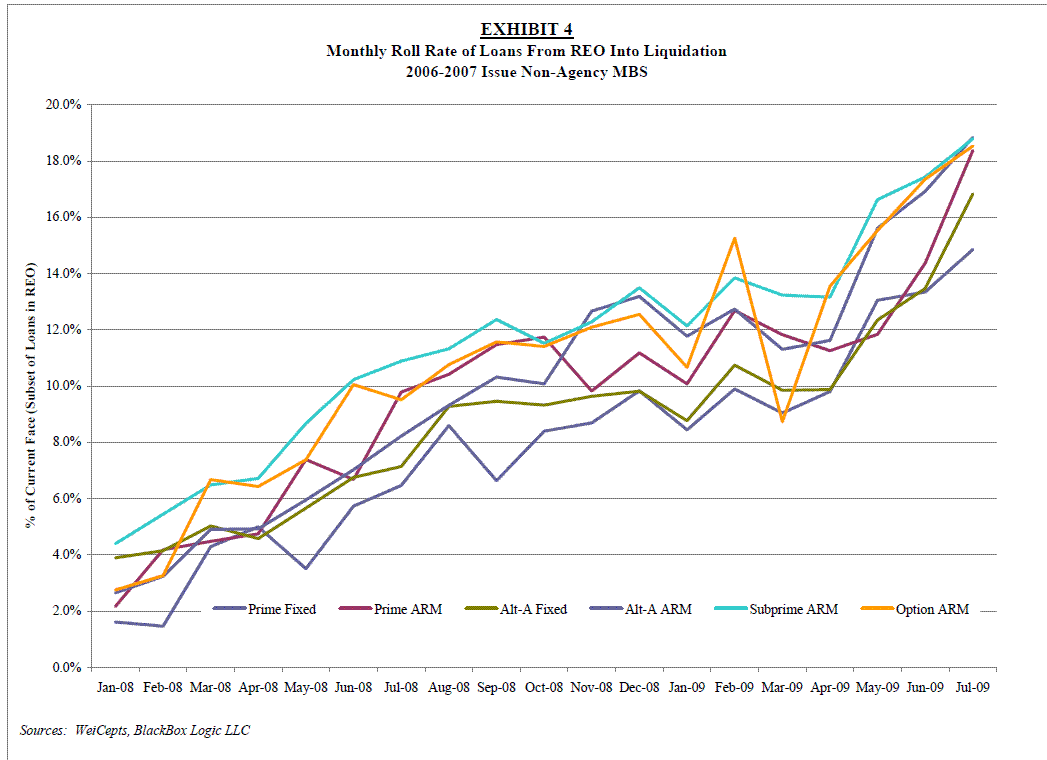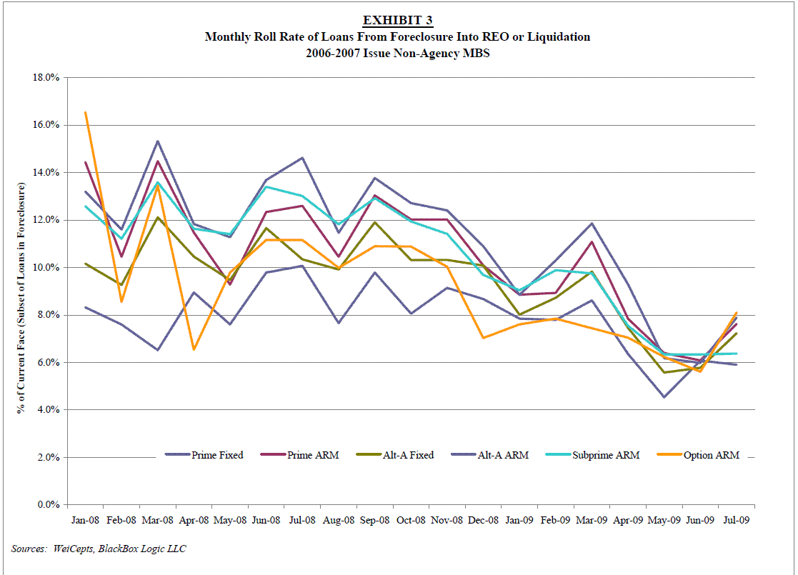 It is important to note that while the breakeven points appear long at first glance, they are realistic in the current environment of a rising number of foreclosure and a severely clogged foreclosure pipeline. For example, as of July 2009, we estimate that the average seriously delinquent loan (D60+) in a Countrywide pay-option deal hasn’t been current for twelve months, while the average loan in foreclosure hasn’t been current for 17 months (footnote 2). Also, as discussed previously, recent trends indicate slower, not faster, processing of seriously delinquent loans.