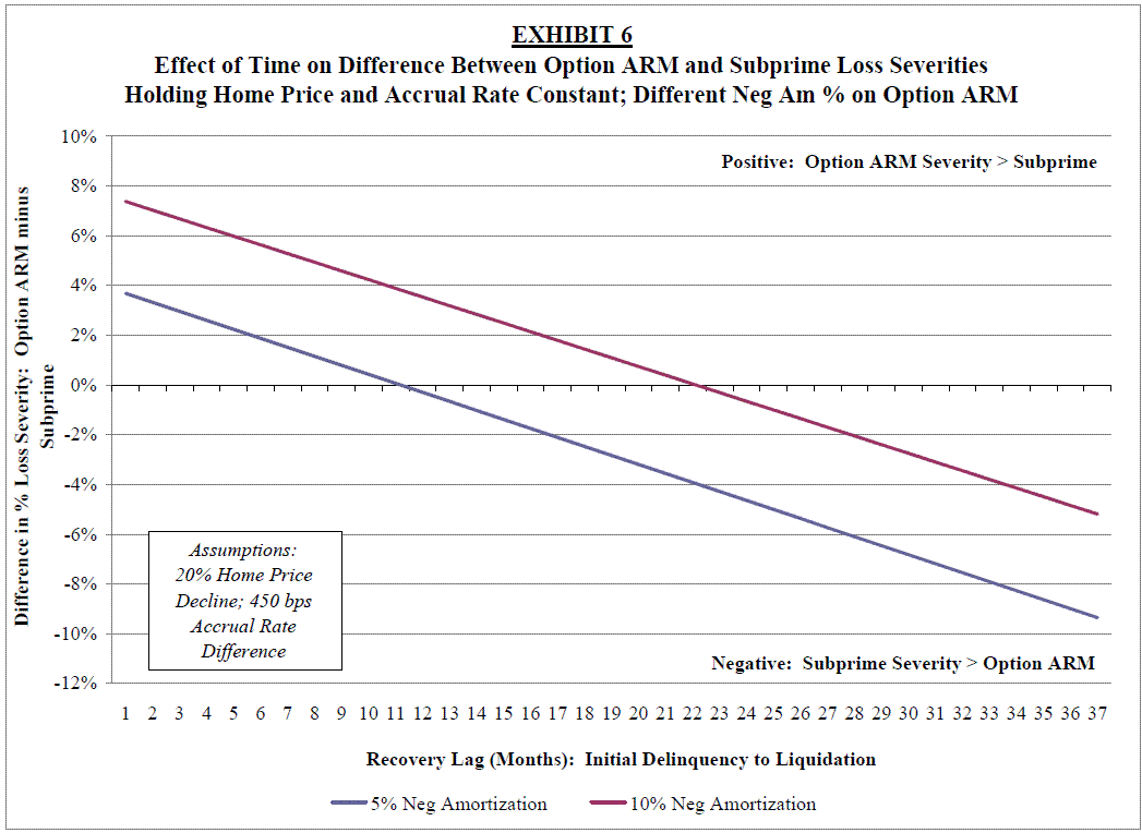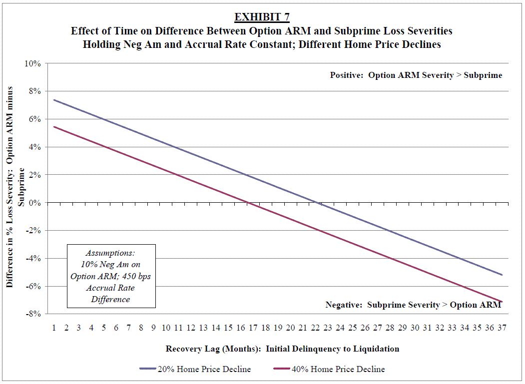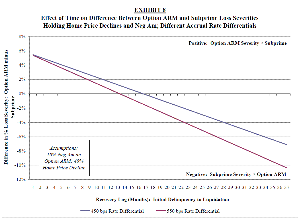 To summarize, the difference in loss severity between a subprime ARM and an option ARM as time elapses can be characterized as follows: