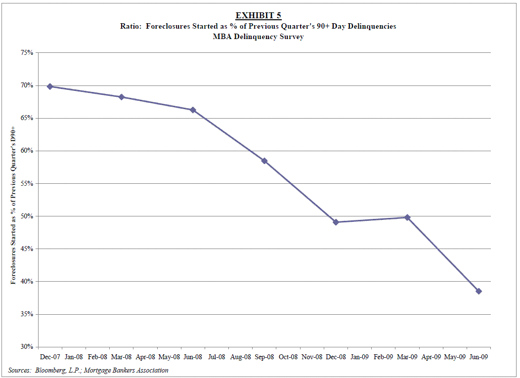 Finally, Exhibit 5 gives a slightly different look at a much larger loan universe, from the MBA delinquency survey. Here, we show quarterly foreclosures started as a percentage of 90+ day delinquencies at the end of the previous quarter. This measure is somewhat analogous to Exhibit 2, painting a nearly identical picture over a broader population. This data confirms that the pipeline blockage phenomenon is not confined to non-agency MBS, but is endemic to the entire system.