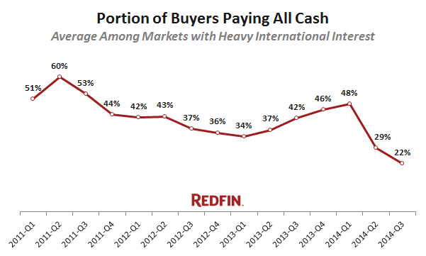 Like foreign investment, all-cashrndeals are also no longer the norm. Inrnthose seven cities that have relied heavily overseas investment cashrntransactions have fallen from about 48 percent of million dollar sales at thernbeginning of this year to 22 percent in the third quarter. In Los Angeles cash sales have fallen to 10rnpercent.</p