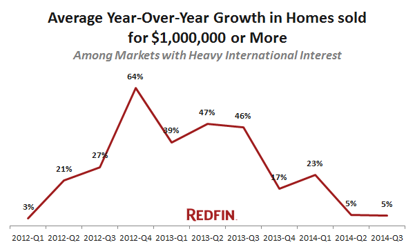 Redfin looked at seven markets whichrnhave previously benefitted from heavy international buyer participation. The seven, Los Angeles, Orange County, Riverside-SanrnBernardino, Miami, Orlando, Fort Lauderdale and Las Vegas, still have strongrnsales in the $1 million plus category but growth has stalled, dropping onrnaverage from 46 percent to 5 percent. rnHowever in Los Angeles and Orange County growth in million-dollar-homernsales has flatlined; in Las Vegas it has been negative for the last threernquarters. </p
