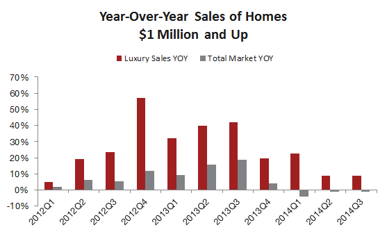 Sales of home costing more than $1 millionrnincreased by 9 percent in the third quarter of 2014 even as all home sales wererndown 1.2 percent when compared to the third quarter of 2013. However Redfin says that overseas investmentrnin these homes is beginning to flag and those markets which have benefitted thernmost from foreign investors are seeing “a steady and dramatic decline in salesrnof million-dollar-plus homes.” Thoserncities where there is less reliance on investors, both foreign and domestic,rnare still seeing a steady increase in high-end sales. </p