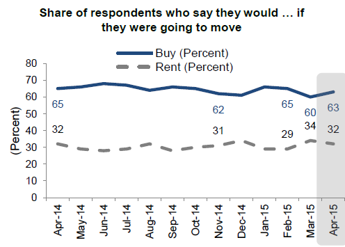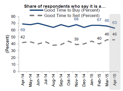 Sixty-three percent of respondentsrnindicated that they would prefer to buy a home at their next move, up from 60rnpercent in March, but those who said it is now a good time to buy fell by fourrnpoints to 63 percent. The share of thosernwho thought it is a good time to sell remained stable at 46 percent which isrnthe survey high.</p