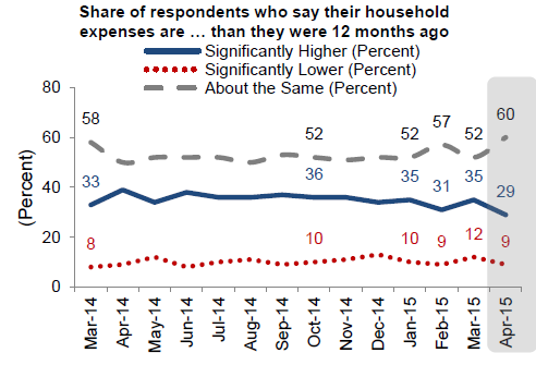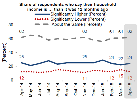 When it comes to the economy 42 percentrnnow say it is on the right track, a loss of 5 percentage points since it hit arnsurvey high in February. About the samernnumber of respondents expect their own personal financial situation to improvernor stay the same over the next year as in March – about 45 percent in eachrncategory, but the percentage who expect it to get worse dropped from 14 to 10rnpercent, a new survey low. Fewer alsornreported either a decrease in household income over the last year or anrnincrease in household expenses.</p