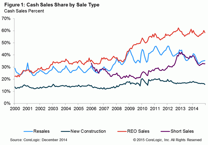 The share of all cash sales continue to fall in December alongrnwith the volume of distressed property sales. CoreLogic said on Monday thatrn35.5 percent of total home sales in December were all cash, down from 38.5rnpercent from December 2013 and 0.5 percent lower than just a month before. The sharernof cash sales has fallen year-over-year since January 2013, making December thern24th straight month of declines.</p