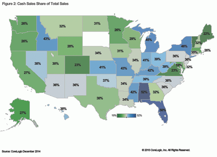 The highest proportion of cash sales in December were inrnAlabama at 52.2 percent followed by Florida at 50.3 percent.  Florida is still in the throes of arnforeclosure crisis, but both states are also popular destinations for retireesrnwho may be buying real estate with cash pulled out of their pre-retirement homes.  Other states with high levels of cash sales werernNew York (45.9 percent), Michigan (44.6rnpercent) and Idaho (42.9 percent). </p