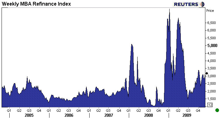The Refinance Index increased 11.1 percent from the previous week. The four week moving average is up 1.6 percent for the seasonally adjusted Refinance Index.The refinance share of mortgage activity increased to 74.4 percent ofrntotal applications from 72.1 percent the previous week.