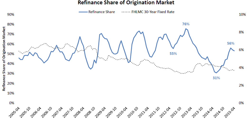 While the trend will likely continue to reverse in the next few reports, refinancing, as a share of total originations, made an impressive recovery through the first quarter of 2015 after falling off the pace inrn2014.  Black Knight’s April MortgagernMonitor reports that, while the refinancing share dropped back slightly in April,rnrefinancing accounted for over 50 percent of originations, hitting a high of 56rnpercent at one point in the quarter.  </p