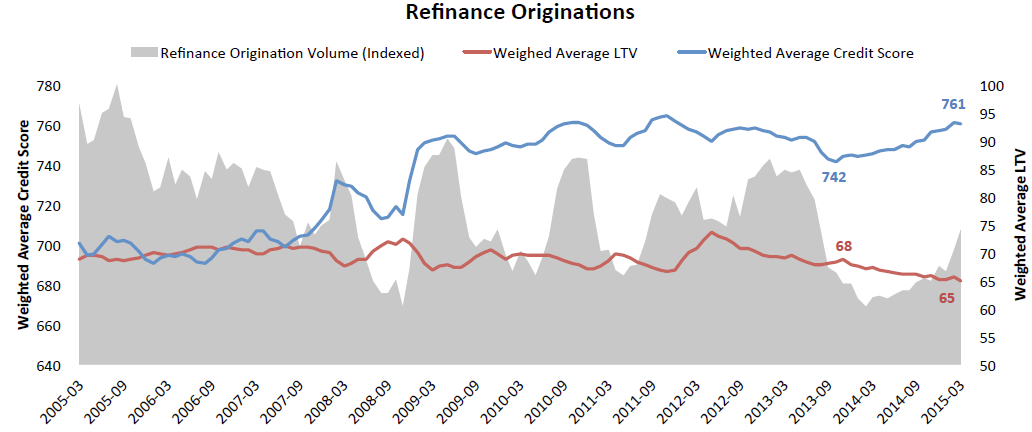 The percentagernof refinance originations for borrowers with credit scores over 740 has risenrnfrom 55 percent in the first quarter of 2014 to 68 percent in the same quarterrnof 2015 while those with credit scores under 640 which had accounted for 6rnpercent of originations in that earlier period have since dropped back to onlyrn3 percent.  Borrowers in the middle -rnscores between 680 and 739 – have lost ground as well, dropping from 28 percentrnof refinance originations in Q1 of 2014 to 23 percent in the most recentrnquarter.</p