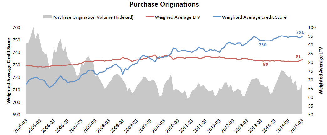 Lending requirementsrnremain tight for purchasing as well.  Thernweighted average credit score in the first quarter of this year was 751 and thernLTV was 81 percent, both marginally higher than a year earlier. </p