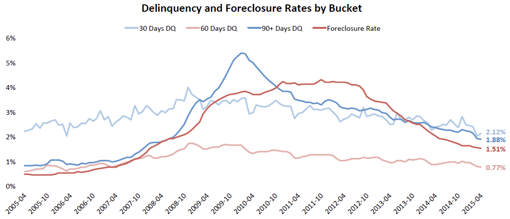 Thirty-day delinquencies are were down 11 percent year-over-yearrnand are now below pre-crisis rates at 2.12 percent.  Sixty-day delinquencies, at 0.77 percent arernjust slightly above pre-crisis norms. rnDelinquencies of 90 days or more remain at double pre-crisis levels ofrn.88 percent at 1.9 percent but significantly lower than at the peak of 5.4rnpercent in January 2010.</p