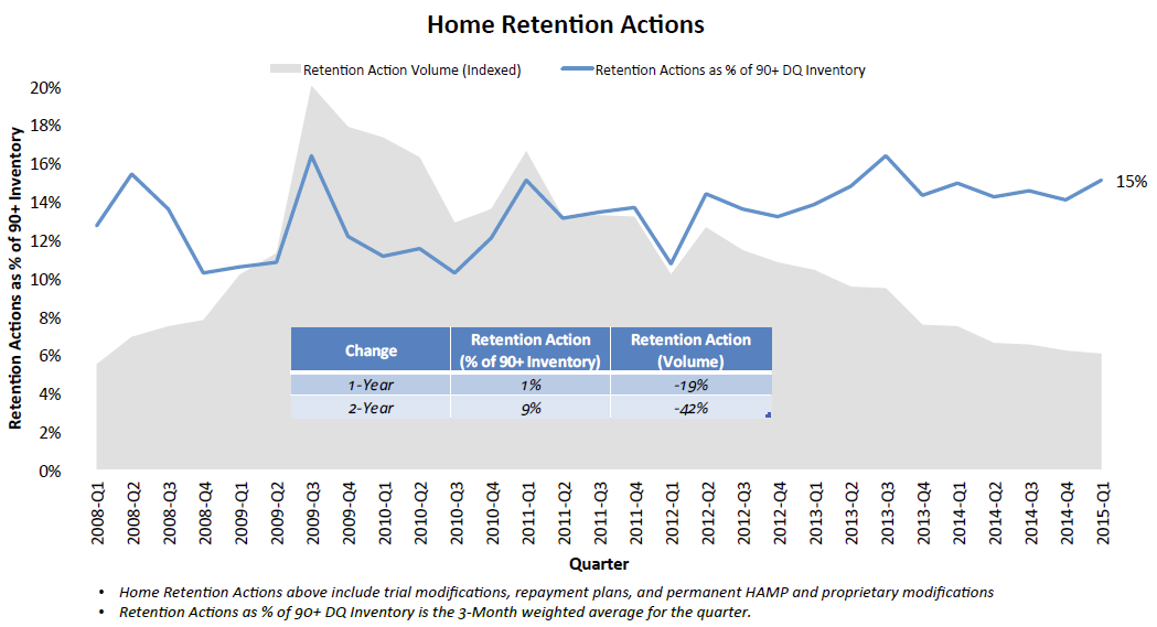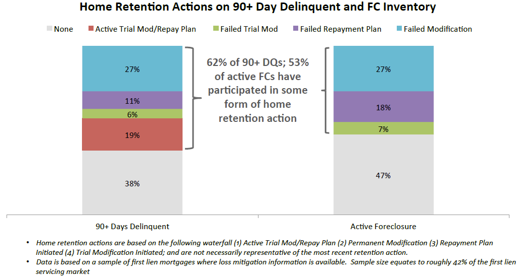 Looking at this home retention data onrna geographic level, Washington, D.C., led the nation with 67 percent of itsrnseriously delinquent inventory having gone through some sort of home retentionrnactivity; of these, 26 percent are currently in an active trial modification orrnrepayment plan. Maryland, Georgia, Texas and Connecticut followed; all with 66rnpercent of seriously delinquent loans having a history of home retentionrnaction.   Among loans in activernforeclosure about 53 percent had taken part in home retention initiatives.</p