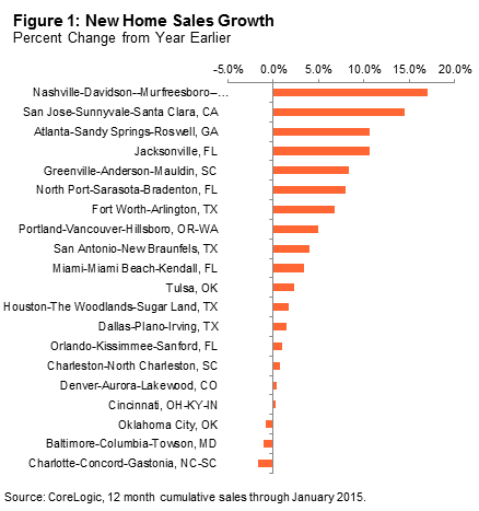 New home sales increased nationally in the 12 months ended in January by 3rnpercent but rose by as much as 17 percent in some fast growing southernrnmetropolitan areas. The region claimed eightrnout of 10 of the markets where the sales increase was the greatest compared to thernsame period a year earlier, led by Nashville the 17 percent gainer. One of the two big increases outside of thernSouth was in San Jose (the other was Portland, Oregon, in eighth place) wherernnew home sales rose 14 percent.</p
