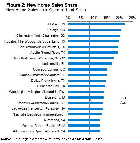 CoreLogic also looked at those markets where new home sales made up thernlargest portion of all sales and again these were predominantly in the Southrnincluding all but one of the top ten. Thernmarket with the highest new home sales share was El Paso, where 22 percent ofrnall sales were new construction, compared with only 8 percent nationally. The author of the article regarding thesernsales, Sam Khater says that this is not atypical of El Paso where the overallrnhousing market has been stable and the portion of new home sales has been asrnwell, averaging 22 to 24 percent over the previous 15 years.</p