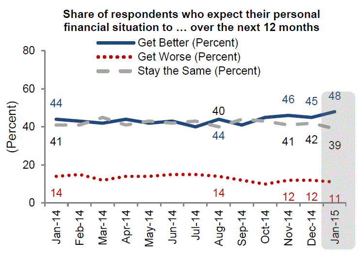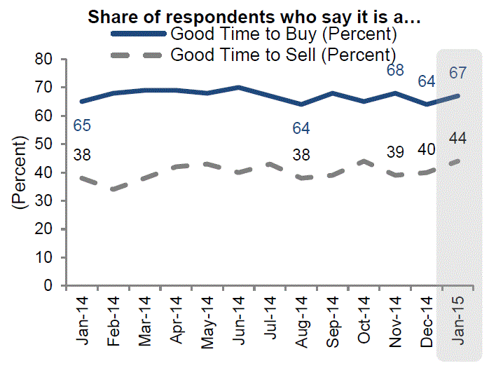 Doug Duncan, FanniernMae’s senior vice president and chief economist said, “Consumersrnare as positive about their personal finances at the start of 2015 as they havernbeen since we launched the National Housing Survey in 2010, and this optimismrnseems to be spilling over into housing market attitudes.  Consumers are more optimistic about thernenvironment both for buying and for selling a home today, and the share whornplan to own on their next move has jumped back up, reversing a three-monthrntrend toward renting. </p