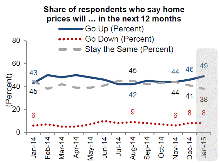 Expectations for home price increasesrnalso jumped with 49 percent expecting price hikes over the next 12 months, up 3rnpoints, and the size of that increase rising from 2.3 to 2.5 percent.  At the same time slightly fewer respondents anticipaternincreases in rents, down one point to 52 percent, and the estimated size of anyrnincrease fell 5 basis point to 3.6 percent. </p