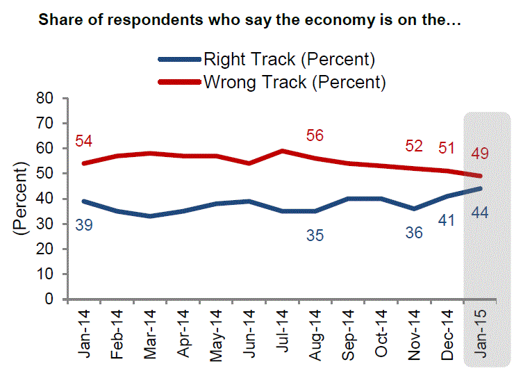 Finally, the right track-wrong trackrnnumber has shifted significantly since November with the right track numberrnincreasing 8 percentage points over that period to 41 percent.  The gap between the two sentiments has now narrowedrnto 5 percentage points.  </p