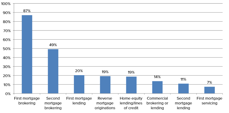 All 50 states, the District ofrnColumbia, Puerto Rico and the U.S. Virgin Islands engaged NMLS tornlicense their mortgage companies, branches, and MLOs in 2012. Companies within the state-supervised mortgage industry engage in arnwide variety of business activity; 87 percent reported they engage inrnfirst mortgage loan brokering and 49 percent in second mortgagernbrokering. Twenty percent are engaged in first mortgage lending. </p