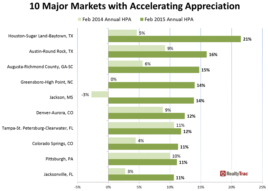 Prices gains did not slow in allrnlocations of course.  Houston’s annualrnappreciation more than quadrupled from a year earlier – from 5 percent to 21rnpercent.  Seven of the ten cities withrnthe most rapid acceleration are located in the Sun Belt.</p