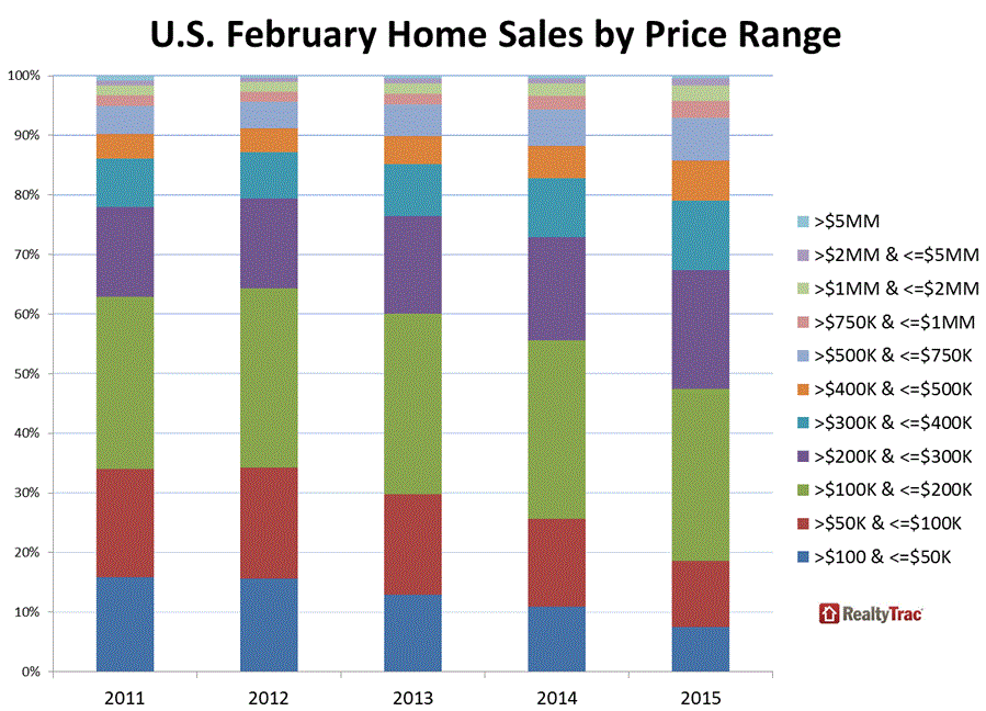 Part of the continuing thoughrndiminished rise in home prices can be accounted for by a shrinking of thernproportion of sales at the lower end of the market.  The share of sales of homes under $200,000rnhave fallen from 63 percent in February 2011 to 47.4 percent in February 2014rnwith virtually all of that decrease coming from sales under $100,000.  During the same period the share of sales inrnevery other price category except homes over $5 million (which declined by 15rnpercent) have risen by double digits. </p