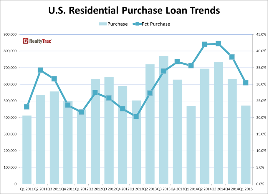 Originations for home purchasesrnnumbered 471,822, down 25 percent from the previous quarter and 1 percent higherrnthan a year earlier. There were 1.08rnmillion originations for refinancing, an increase of 6 percent for the quarterrnand 27 percent compared to the first quarter of 2014.</p