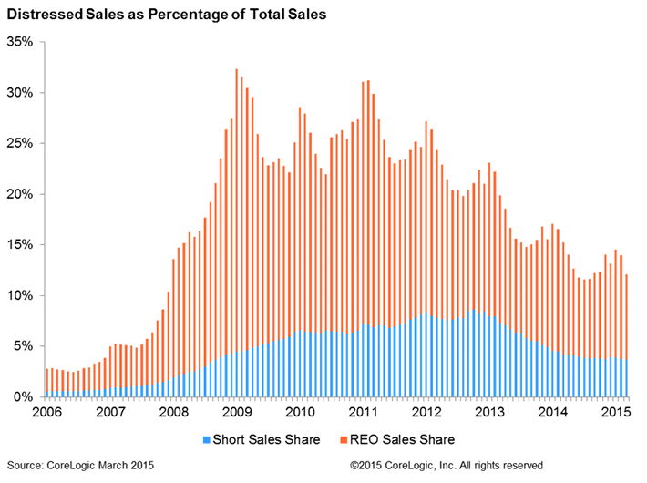The percentage of total home sales coming from distressedrninventories continues to drop. CoreLogicrnsaid on Monday that short sales and sales of owned real estate (REO) fell 3.2rnpercentage points from March 2014 to March 2015 and were down 1.9 percent fromrnFebruary to March. </p