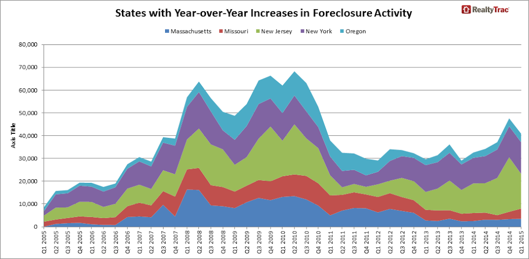 Foreclosure activity increased by 20 percent inrnMarch compared to February and was up 4 percent from a year earlier. RealtyTrac, in its combined March and 1st</supQuarter 2015 report said it was the first annual increase in foreclosurernfilings, which include default notices, scheduled auctions, and completedrnforeclosures or bank repossessions, since September 2010 but that the increasesrnindicated a cleanup of lingering problems rather than a new round ofrndistress. </p