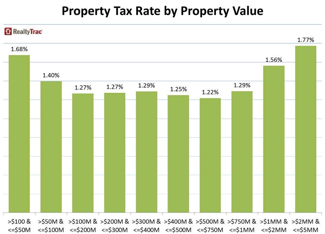 RealtyTrac cut the data in several ways and came up withrnsome interesting findings.  First, itrnfound that owners of very high end and very low end homes pay the highestrnproperty tax rates.  The averagerneffective property tax rate (average taxes on a single family home in 2014rndivided by the average estimated value of the home) was 1.29 percent.  Where a home had a market value of $50,000 orrnless, the rate was 1.68 percent and for those valued between $50,000 andrn$100,000 it was 1.40.  As seen in thernchart below, when property values rose above $100,000 the rate dropped belowrn1.30 percent and stayed there until values hit $1 million.  Then the rate climbed, reaching 1.77 percent forrnproperties over $2 million in value. </p