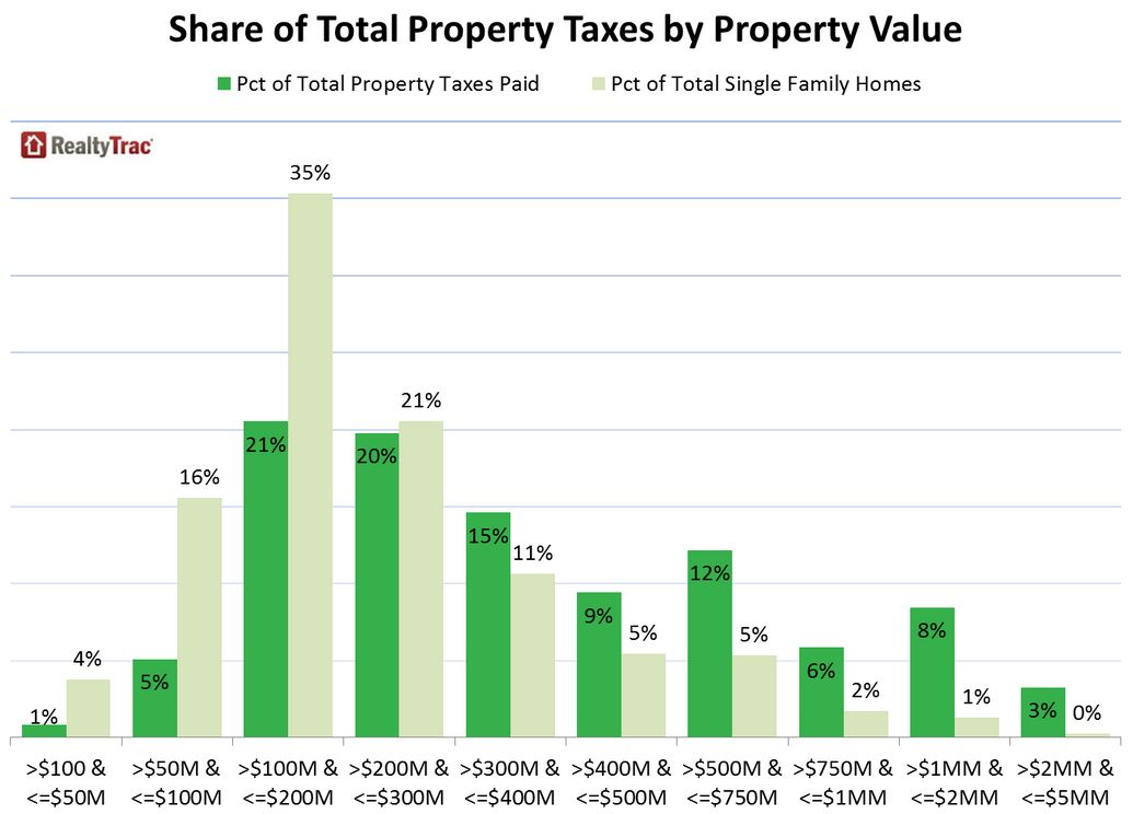 Despite the mid-level rate of taxes, the 25 percent of homesrnvalued above $300,000 were responsible for 54 percent of taxes paid nationwidernwhile the homes under $300,000 accounted for 75 percent of the housing stockrnbut paid only 46 percent of taxes.</p