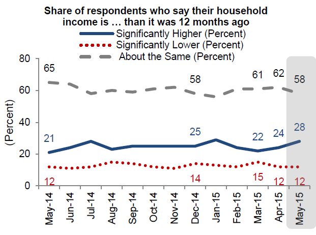 The recent improved employment statistics which included anrnacceleration in average hourly earnings and a reported increase in personalrnincome (a March to April bump of 0.4 percent) were reflected in Fannie Mae’srnMay National Housing Survey. Thernshare of survey respondents reporting a significant increase in their householdrnincome of the last 12 months climbed 4 percentage points to a near all-timernhigh of 28 percent. Those expecting an improvement in their personal financialrnsituation rose 1 point to 46 percent, the highest rate in at least a year. </p